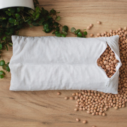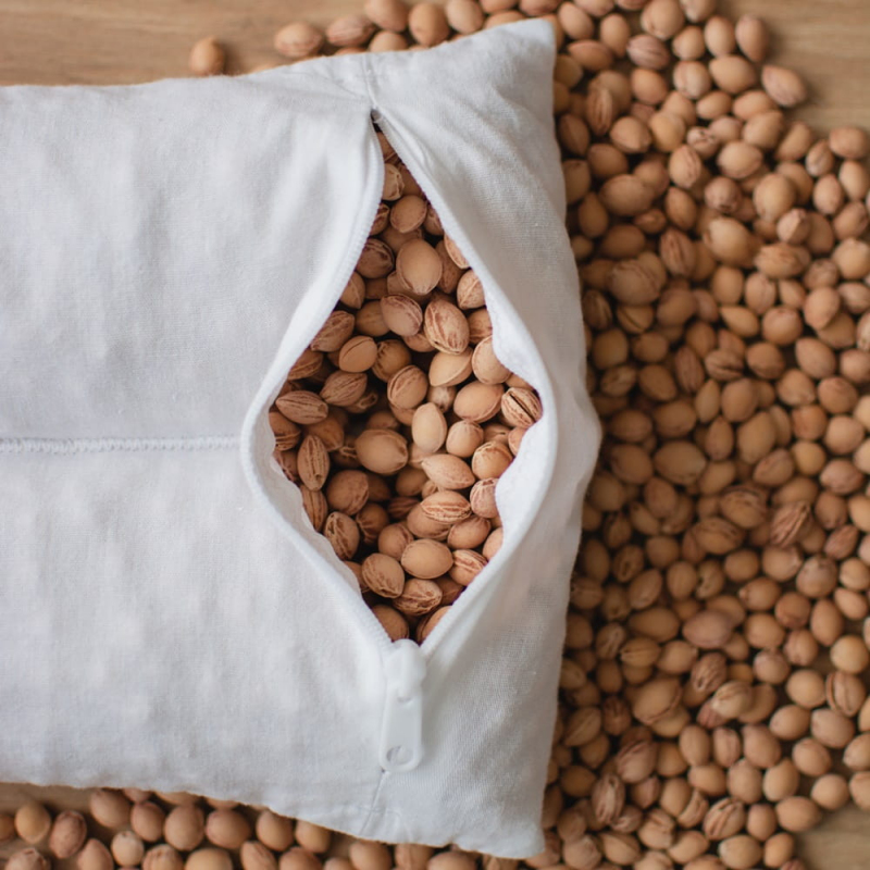 Bawełniany worek wypełniony suszonymi pestkami wiśni. Tkanina zapewnia swobodną cyrkulację powietrza, dzięki temu pestka wiśni może oddawać ciepło.